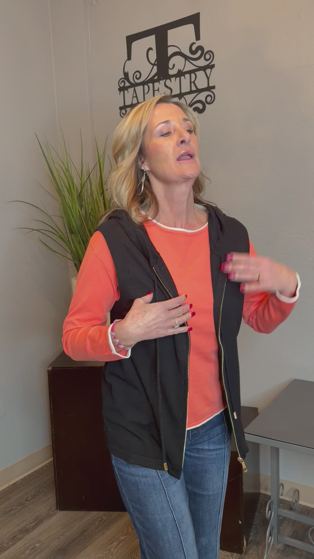 Stay comfortable and stylish with this sleeveless hooded zip-up top, designed for layering and movement.   Perfect for active days or relaxed weekends, this versatile essential bridges casual and contemporary aesthetics with effortless appeal.